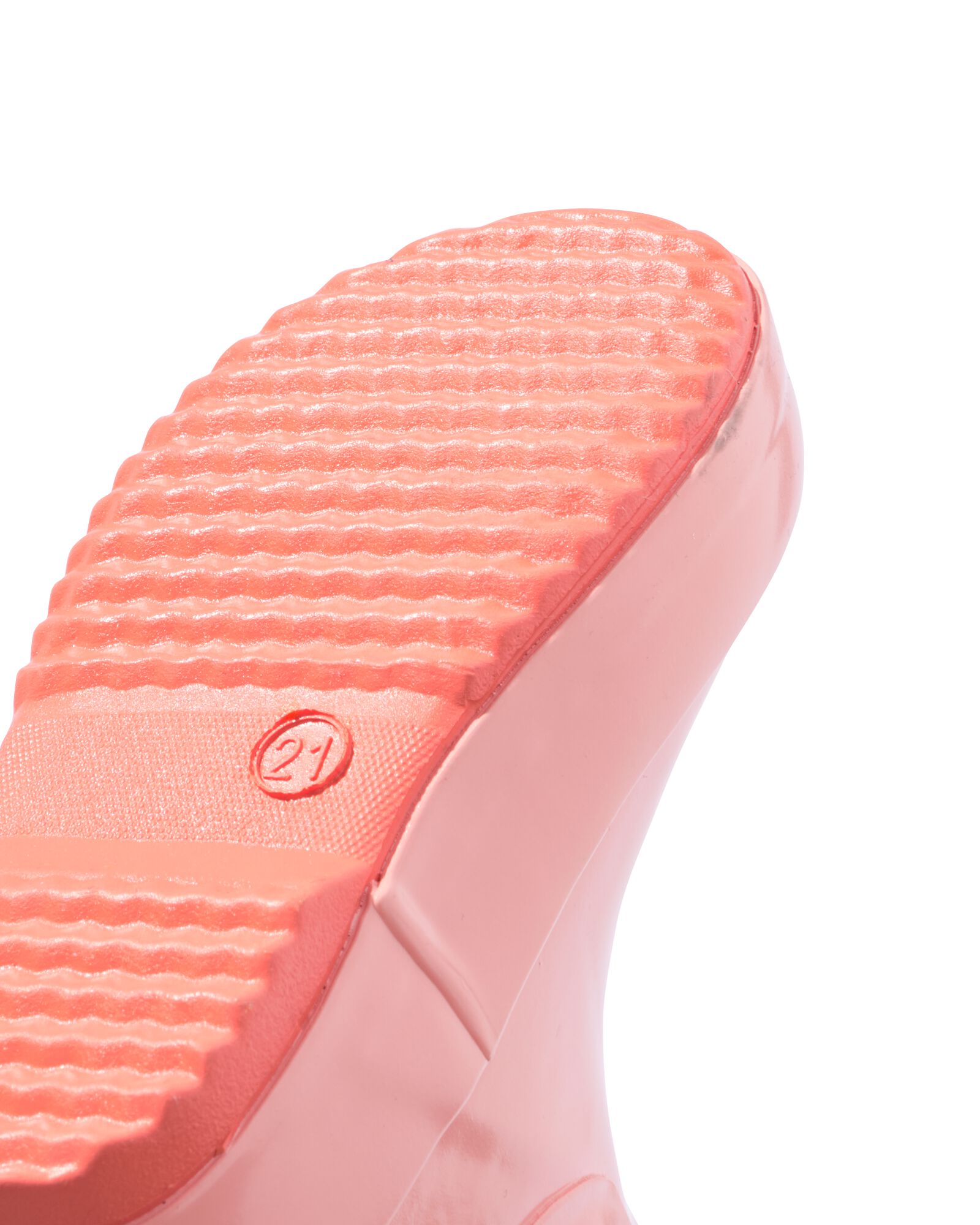 Een paar lage koraalroze baby regenlaarzen met een stevige profielzool, waar je ook de maat kunt terugvinden. Aan de achterkant zit een lange reflecterende streep, wel zo veilig, want zo zijn ze beter zichtbaar in het donker en bij slecht weer. Door de twee halve zonnetjes aan de binnenkant kunnen kinderen ze veel makkelijker zelf aan de juiste voet aantrekken. De lus aan de bovenkant en het elastiek aan weerskanten zijnmakkelijk bij het aan- en uittrekken. Met deze regenlaarzen kunnen ze lekker door de plassen stampen en blijven de voeten droog. Ze zijn gemaakt van soepel, glanzend rubber, dat is een natuurproduct dat kan uitdrogen en scheuren als het te snel opdroogt. Laat natte laarsjes dus niet drogen vlak bij een warmtebron.