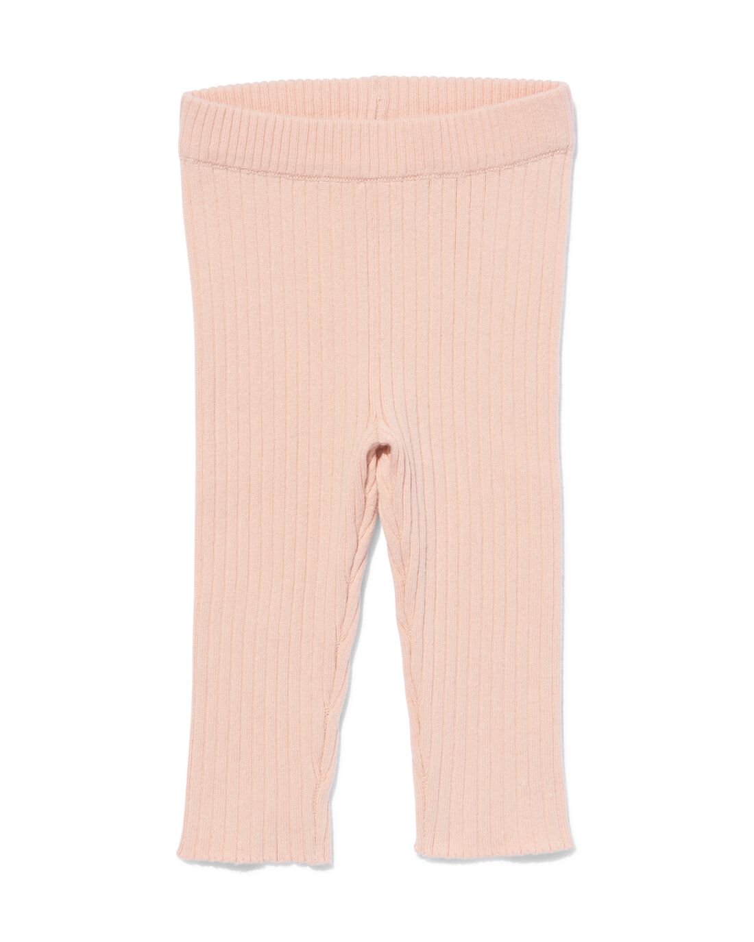 Een gebreide baby legging met een ribstructuur, wat het heel elastisch maakt. De legging heeft een brede tailleband en een lichtroze kleur.