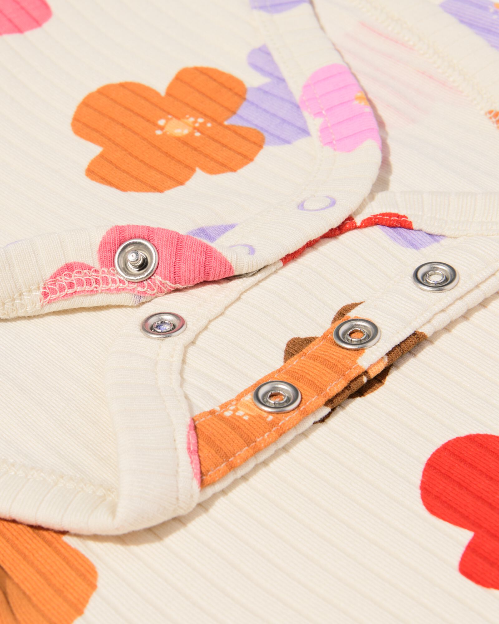 Deze rib romper met bloemenprint heeft een enveloppehals, lange mouwen en extra rek. Dankzij de extra rij drukknopen groeit hij makkelijk mee met je baby. Eg zacht door het gebruik van de ecovero™ vezels.