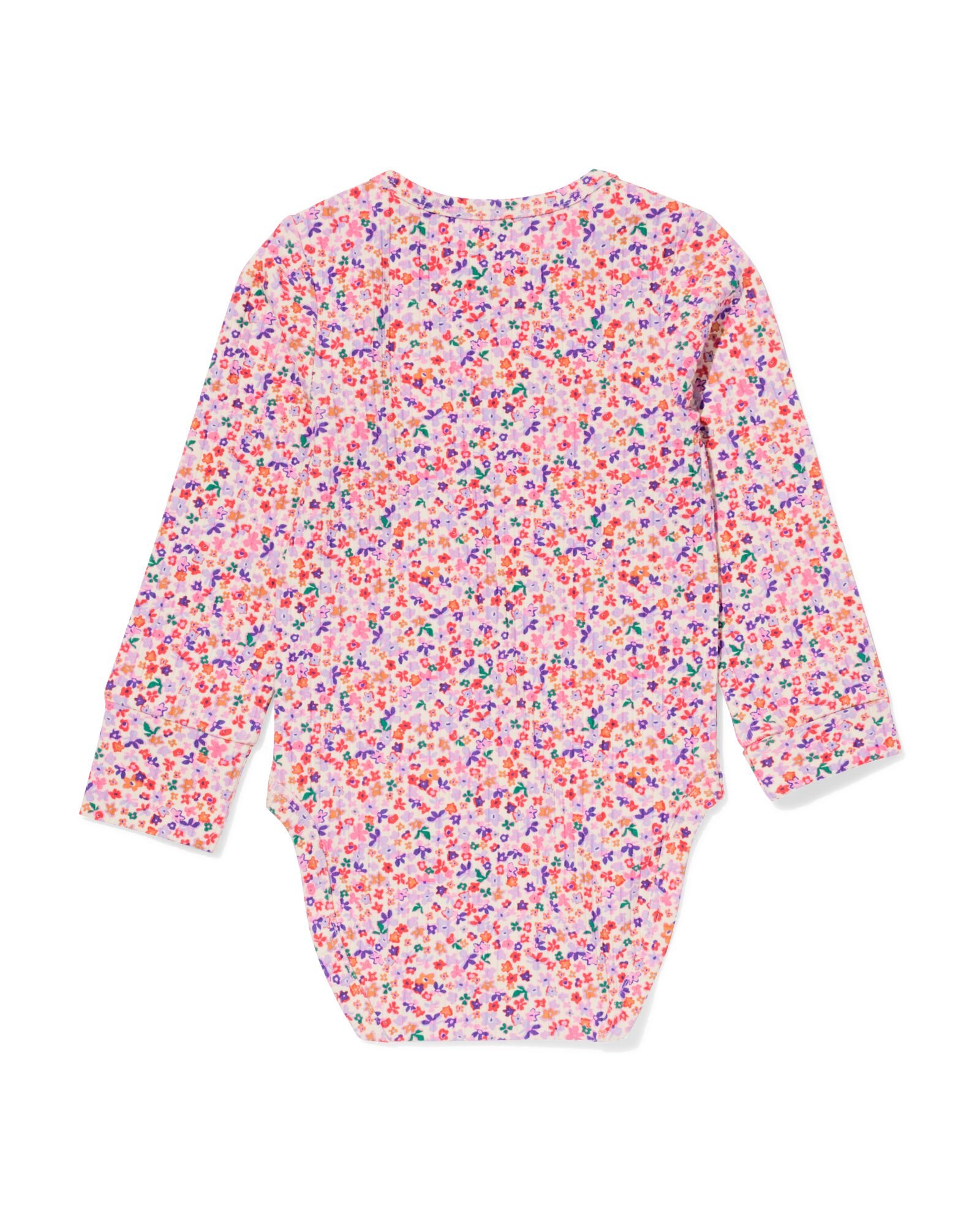Deze romper heeft een vrolijk bloemenpatroon, ribstructuur en lange mouwen. De enveloppehals maakt aan- en uittrekken makkelijk. Met extra rij drukknopen en veel stretch groeit hij met jouw baby mee. Superzacht comfort voor elke dag.